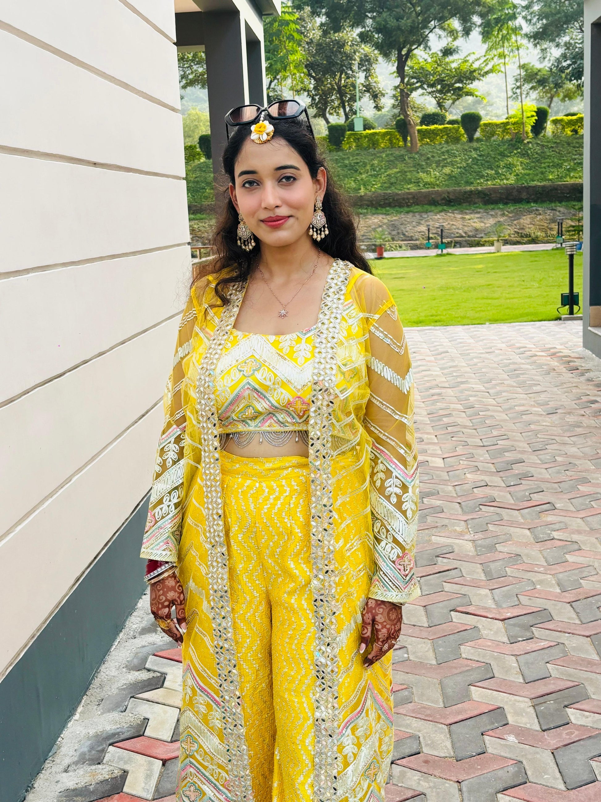 This isBridal outfit or a bridesmaid, a yellow colour with Gotta patti and silver work .